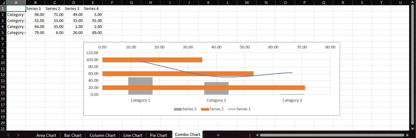 Section titled “Basic Code Sample”G.ComboChartSetting<G.PresentationSetting> comboChartSetting = new(){ titleOptions = new() { title = "Combo Chart" },};comboChartSetting.AddComboChartsSetting(new G.AreaChartSetting<G.PresentationSetting>());comboChartSetting.AddComboChartsSetting(new G.BarChartSetting<G.PresentationSetting>());comboChartSetting.AddComboChartsSetting(new G.ColumnChartSetting<G.PresentationSetting>());comboChartSetting.AddComboChartsSetting(new G.LineChartSetting<G.PresentationSetting>(){ isSecondaryAxis = true});comboChartSetting.AddComboChartsSetting(new G.PieChartSetting<G.PresentationSetting>());